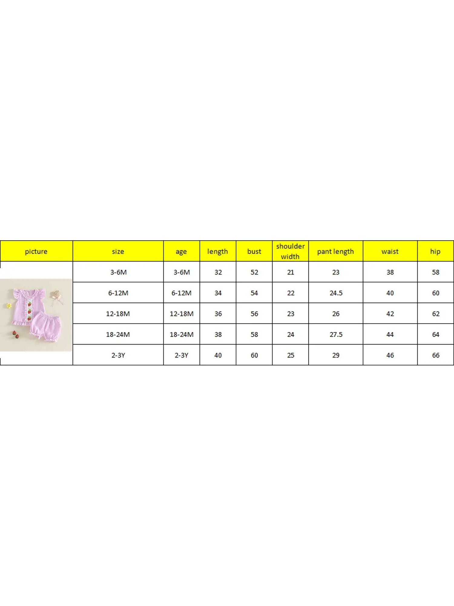 3-6M Tops Length: 32 Bust: 52 Shoulder: 21 Shorts Length: 23 Waist: 38 Hip: 58 Advised Age: 3-6 Months